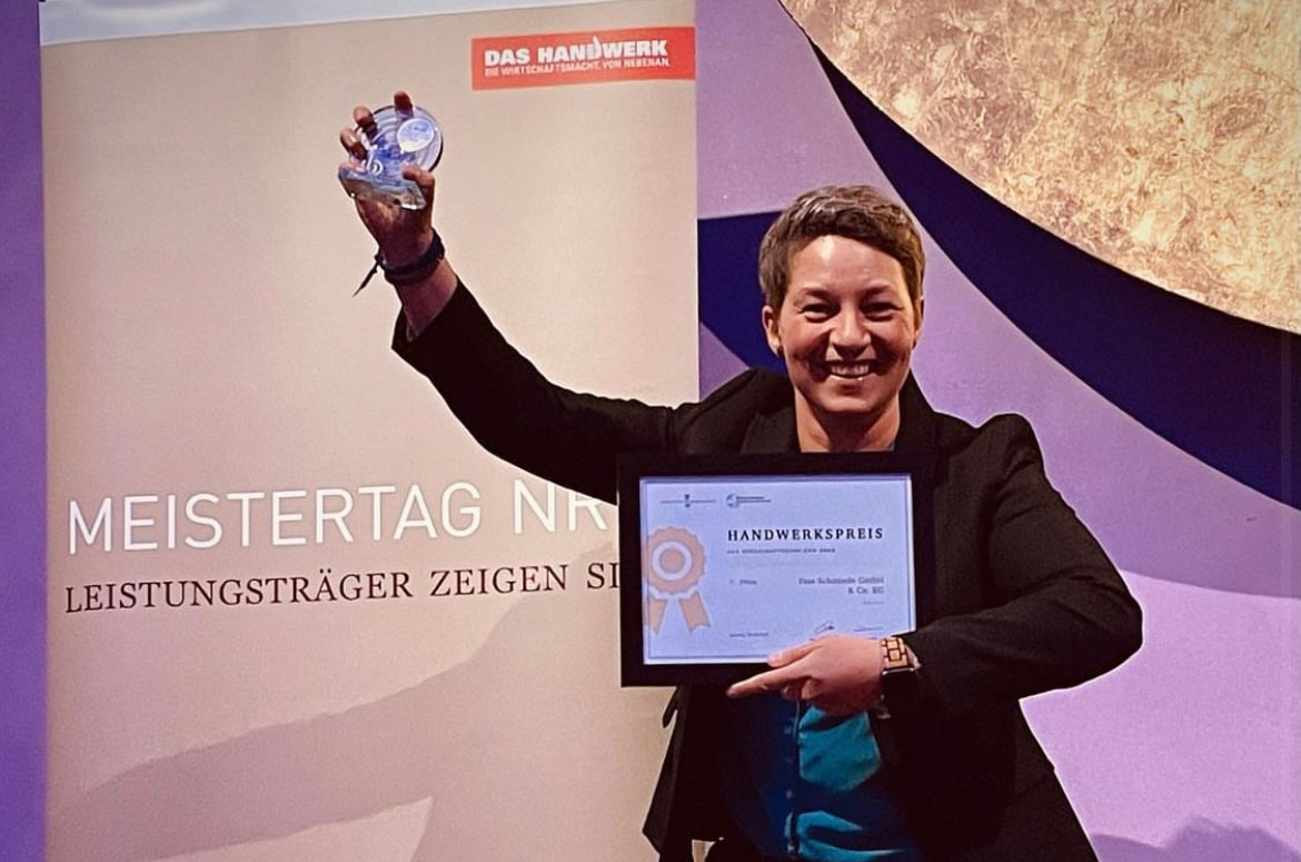 Heute Abend wurde der Fass-Schmiede auf dem 11. Meistertag NRW des Westdeutschen Handwerkskammertages der 1. Platz des Handwerkspreises der Bürgschaftbank NRW überreicht. Jana Lewe ist überwältigt.